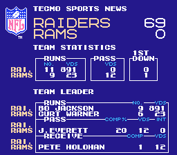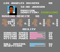 You can thank in part Bo Jackson for cementing the game’s legacy. Bo makes his triumphant return in Tecmo Super Bowl, and he is just as inhuman and unstoppable as before. Interesting fact: This powerhouse player’s rushing stats cannot exceed 4,095 yards. [Update: Brent Adams pointed out that if Tecmo allotted three digits for the rushing yards counter, it would max out at the hexadecimal “FFF,” which translates to 4095.] That strangely specific number is where the counter maxes out, otherwise Bo could potentially collect over 9,999 rushing yards in a single season by taking the ball back to the first yard line every time and just charging the field. (Not to worry; it’s good exercise for him.) Going over that 4,095 yard mark will result in Bo’s average rushing yards actually decreasing over time because the counter can’t keep up with his steam-engine pace. That’s right; among everything else, Bo even knows how to break Tecmo. How fitting for one of video games’ most broken characters.