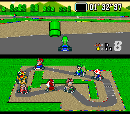 If the player collides with a pipe while being invincible, the kart will make a feather jump over the obstacle instead of knocking it off the screen.