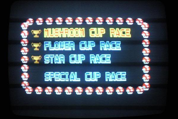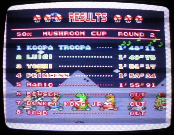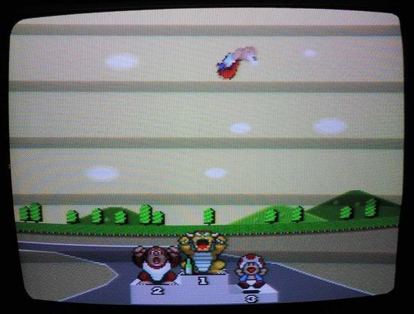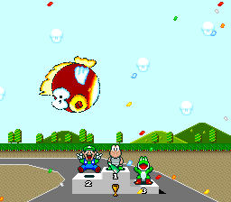 When coming in second place at the end of a Cup Race, a Super Koopa flies in a loop and is then hit by the champagne cork. The player is not awarded a cup.